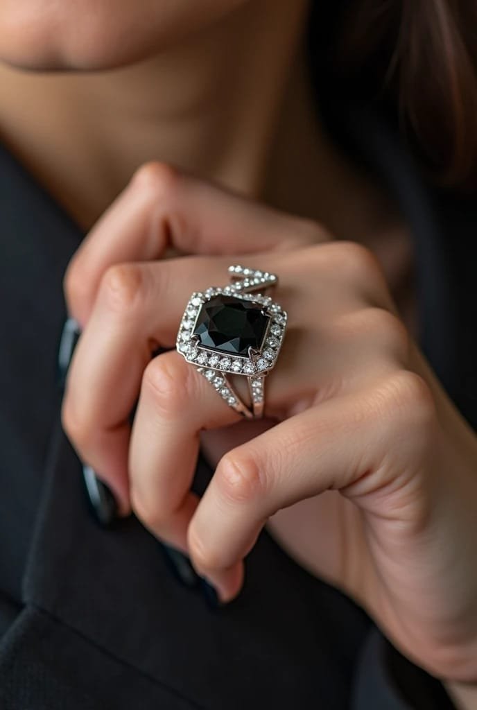 This exquisite ring features a striking black gemstone at its center, cut into a faceted square shape that exudes elegance and mystery.